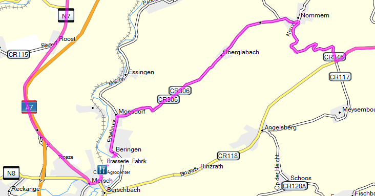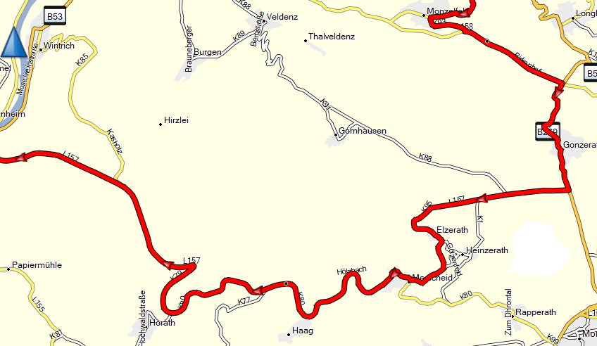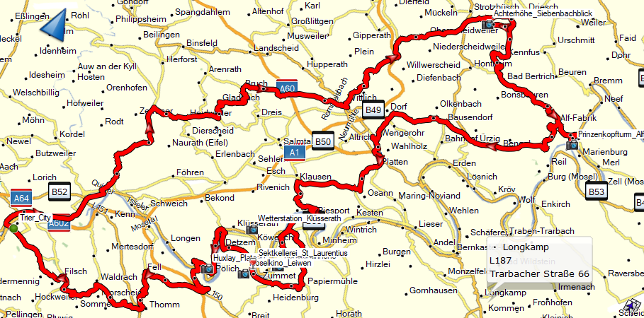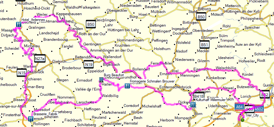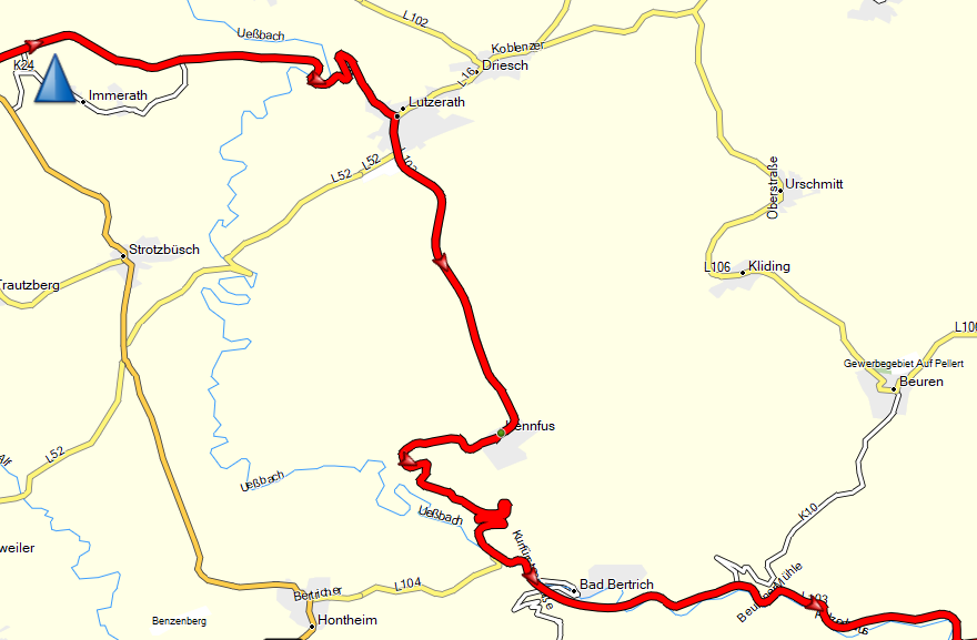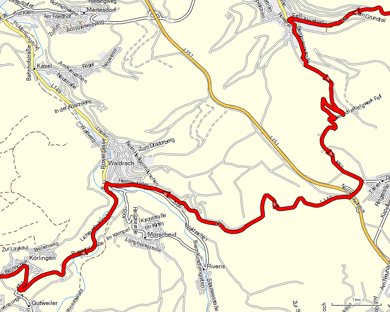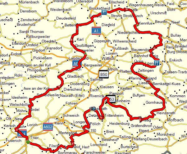 Der Eilzug fährt auf die B 327 und folgt der Beschilderung Trier. D. h. in unserem Fall kurz vor Thalfang auf die L 150 und dann über Fell nach Trier.