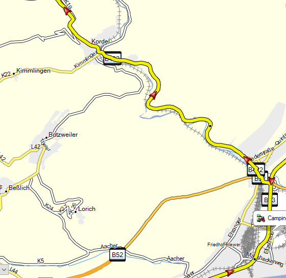 Ähnlich geht es uns an der nächsten Kreuzung (B 421). Wir nutzen nach dem Linksabbiegen kurz die B 421 und verlassen die „B“ nach gefühlten 100m wieder nach rechts, jetzt wiederum auf der L 52 in Richtung Lutzerath unterwegs.
