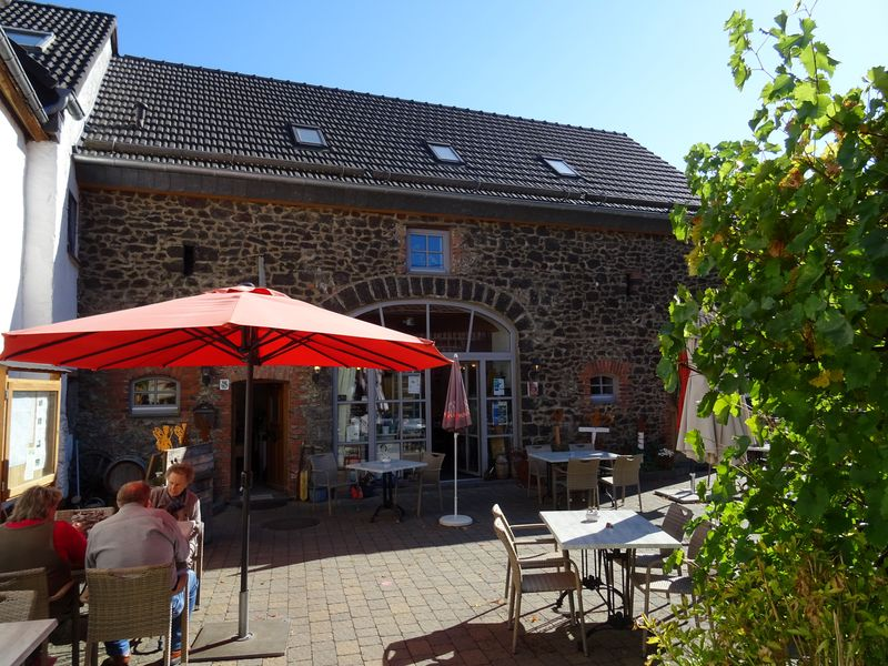 Zeit für eine Pause und eine angemessene Mahlzeit. Also talabwärts an Bremm vorbei nach Ediger-Eller. Im Ortsteil Eller müssen wir jetzt ein wenig aufpassen, damit wir unsere Einfahrt nach links nicht verpassen. Grob an der Kirche von Eller orientieren und dann kann nichts mehr schiefgehen für unsere Anfahrt zum Weincafe Springiersbacher Hof (Oberbachstr. 30). Über Kopfsteinpflaster und enge Gäßchen suchen wir unseren Weg zur Pausenstation und nehmen dann auf der ruhigen Terrasse Platz oder im gemütlichen Gastraum.