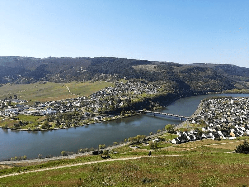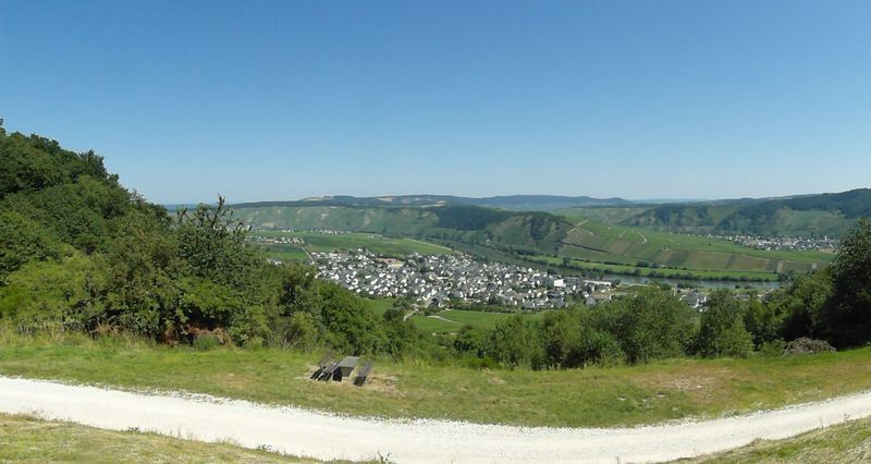 Nach unserer wohlverdienten Pause überqueren wir bei Nehren die Mosel und erklimmen bei Senheim dann die Höhen hinauf zum Hunsrück auf der L 200 (Liesenich → Blankenrath [L202]). Dann rollen wir auf der B 421 wieder talabwärts nach Zell an die Mosel und begleiten den Fluss zur Rechten bis nach Enkirch.