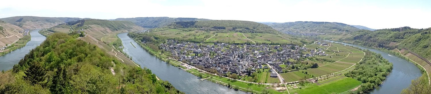 Wir rollen auf der L 16, die im weiteren Verlauf Gevenich führen würde, nach Driesch und verlassen die L 16 nach rechts Richtung „Mosel“ nach Bremm. Die L 106 „verläuft“ zunächst recht unspektakulär, um in einem Schwung von Serpentinen talabwärts zur Mosel zu enden. Bei der ersten „Links-Spitzkehre“ ist zur Rechten eine kleine „Haltemöglichkeit“ für maximal 2 – 3 Motorräder, aber der „Halt“ lohnt sich. Für mich der schönste Blick des Tages von der Höhe auf das Moseltal und die Flußschleife bei Bremm. Auf der anderen Uferseite die Ruine des Klosters Stuben und wenn man den Blick nach links in die Höhen des dortigen Weinbergs richtet, traut man seinen Augen an sonnigen Tagen nicht. Es ist der „Calmont“, seines Zeichens der steilste Weinberg Europas und als ausgewiesener „Klettersteig“ ein Anziehungspunkt für Wanderer. Kein Geheimtipp mehr, denn an trockenen Tagen ziehen sich lange Reihen von Wanderern durch den Weinberg. Manchmal erinnert mich das Bild an alte Aufnahmen des Chilcoot Trail, als lange Reihen von Goldsuchern durch den Schnee in Richtung Klondike marschierten. Hier suchen die Naturverbundenen kein Gold, sondern ein ruhiges Idyll, welches sie mit ihrem eigenen Massenauflauf ad absurdum führen.
