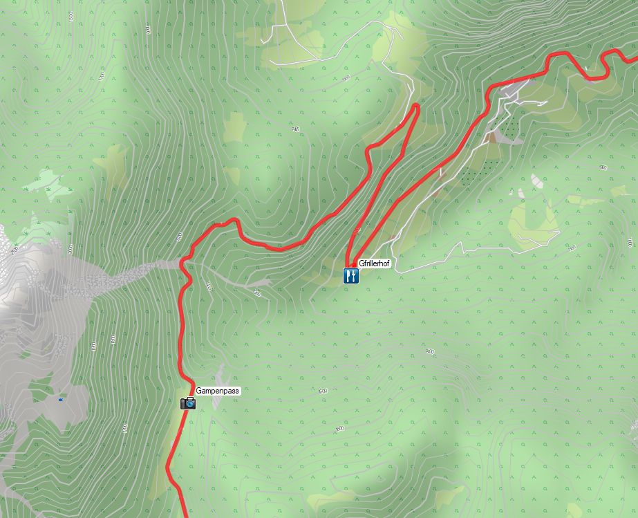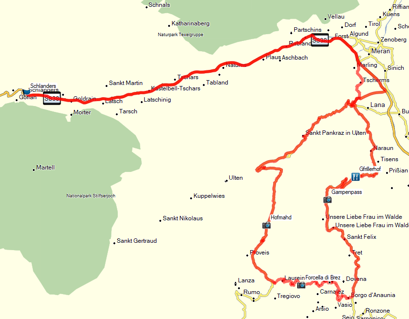 Also machen wir talabwärts in einer wunderbaren 180 Grad-Linkskurve am Gfrillerhof Pause, kehren ein und genießen ein leckeres Essen oder einen feinen Eisbecher. Dabei können wir noch die unterschiedliche Linienwahl der Motorradfahrer begutachten, die von Lana aus hinauf zum Gampenpass streben. Eine typische Applauskurve, die es wahrscheinlich an jedem Pass gibt. Irgendwie bin ich an den Besucherhang in Breidscheid am Nürburgring erinnert. Einige Protagonisten geben alles.