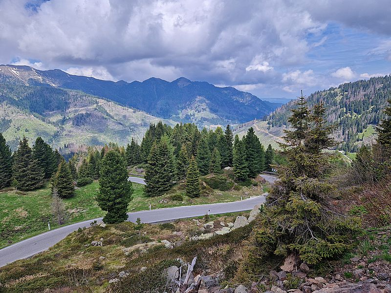 Die Nordrampe des Manghen führt uns auf schmaler Streckenführung durch den Wald bergan. Viele vergleichen dem Streckenabschnitt sogar mit der ungleich bekannteren Südrampe des Passo Giau. Bitte nicht weitersagen, sonst nimmt hier der Verkehr zu, weil das natürlich direkt Begehrlichkeiten weckt.
