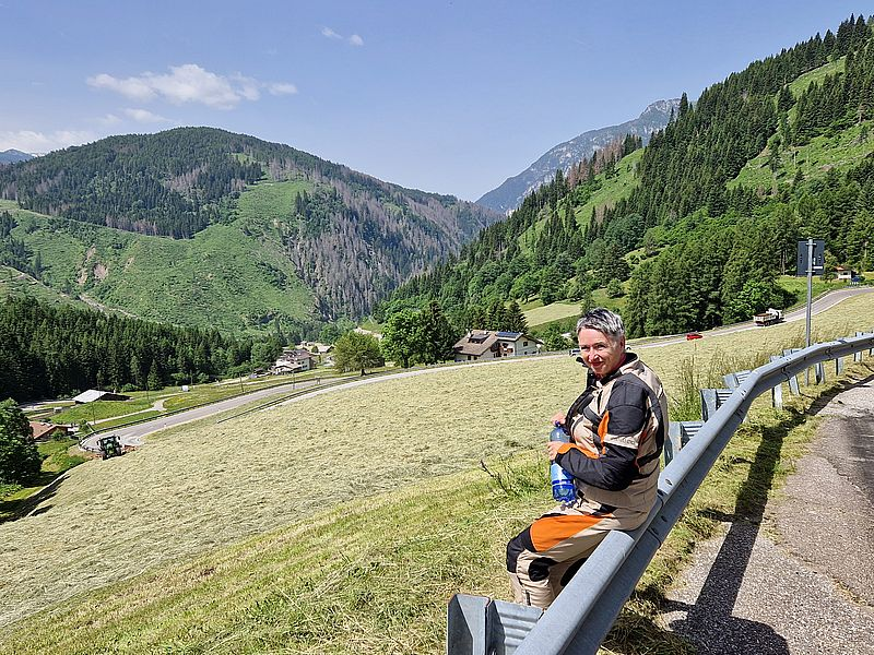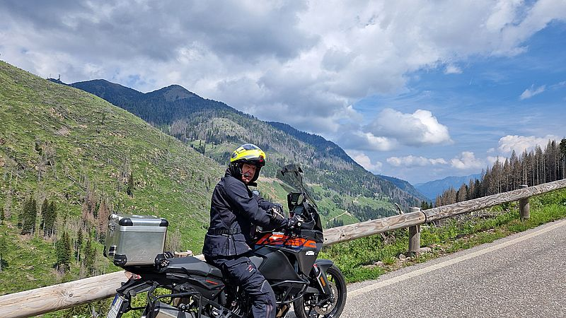 Ambitionierte Fahrradfahrer zählen die Südanfahrt zum Manghenpass zu den langen und harten Anstiegen der italienischen Alpen. Wir fahren die Route weniger kraftraubend mit dem Motorrad abwärts und genießen den traumhaften Ausblick.