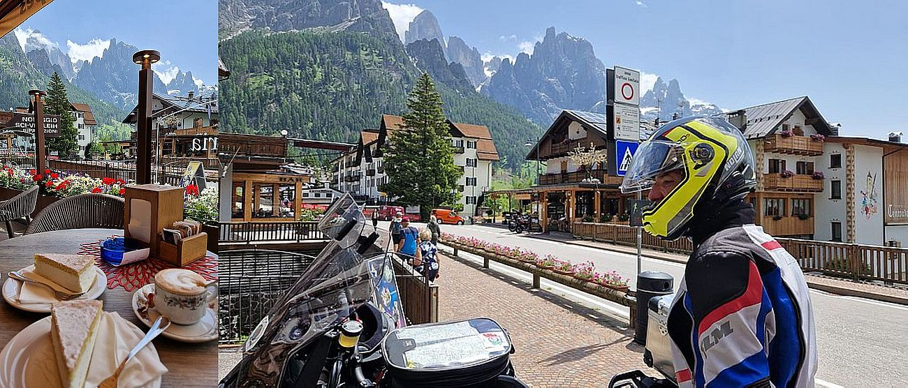 Wir fahren jetzt die Südrampe abwärts über San Martino di Castrozza. Typisch italienisch nehmen wir uns noch Zeit für einen schnellen Kaffee. Natürlich bei uns noch ergänzt mit einem Stück Kuchen.