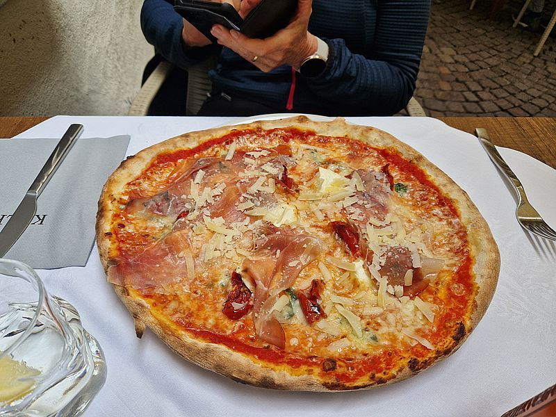 Es geht an den Kalterer See und hier an das ostwärtige Seeufer in das Restaurant Klughammer. Feine Küche, wunderschöne Terrasse mit einem Blick auf den See, Mendel und Penegal, dass man eigentlich Eintritt bezahlen müsste.