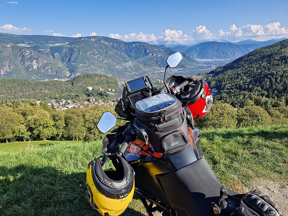Es geht für uns hinauf auf den San-Lugano-Sattel, der das Unterland Südtirols mit dem Fleimstal, also Trentino verbindet. Von seiner Westrampe hat man einen wunderschönen Blick hinein ins Etschtal. Seine 1.097 m hohe Spitze waren schon mehrfach für uns Anlaufpunkt, respektive Zwischenstation. Der San Lugano ist die ideale Transferstrecke, wenn man in Richtung San Pellegrino, Lavaze oder auch Manghenpass möchte. Wir sind hier auf der Strada delle Dolomiti.