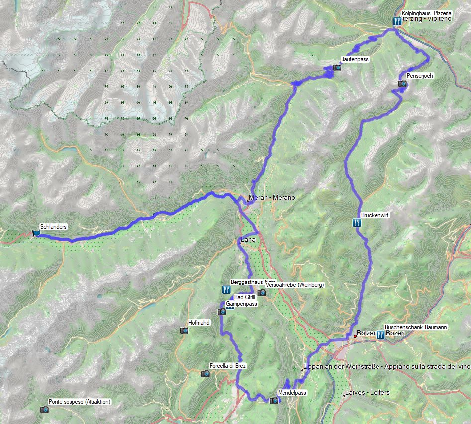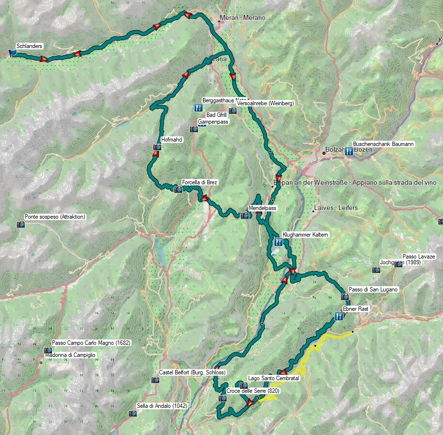 Den ersten Teil unserer heutigen Route kennen erfahrene „Anderstourer“ bereits. Wir können wählen. Zeitig aufgestanden und gestartet? Also dann – bei Lana runter von der Mebo und ein kurzes Stück den Gampenpass aufwärts bis wir links nach Prissian abbiegen und uns dann talabwärts auf kleinen Sträßchen nach Frangart begeben. Hier geht es dann wieder in das Zentrum des Weinanbaus, also Richtung Kaltern / Tramin.