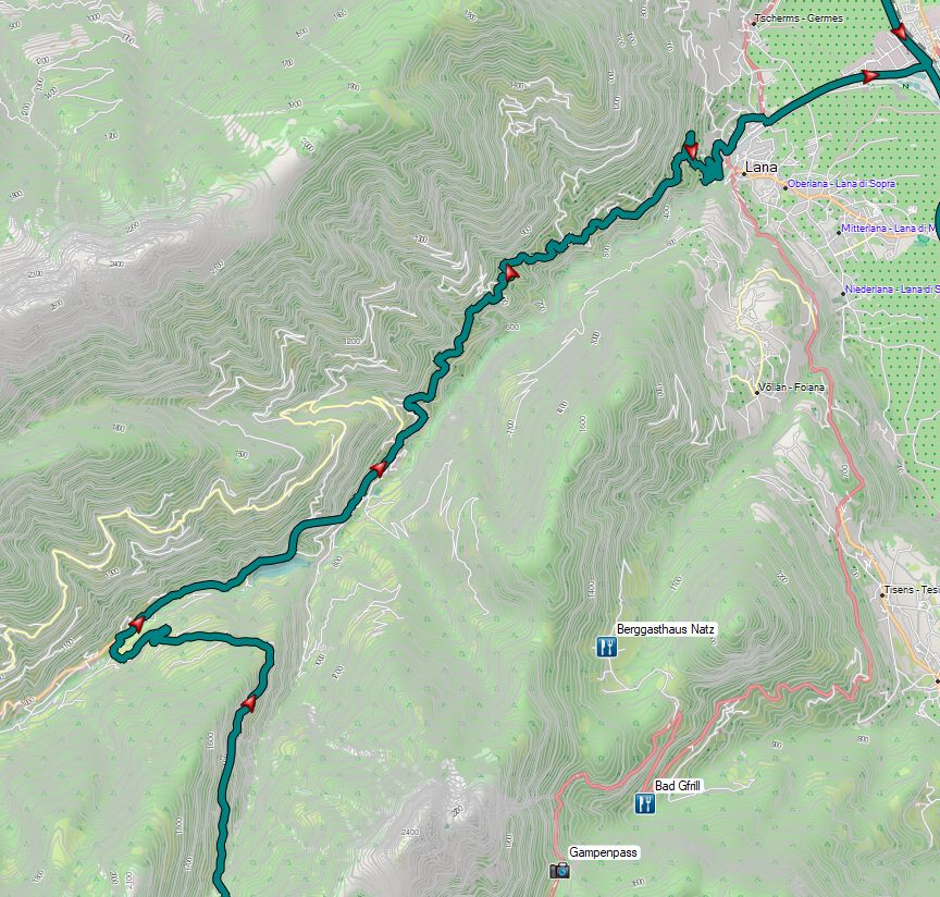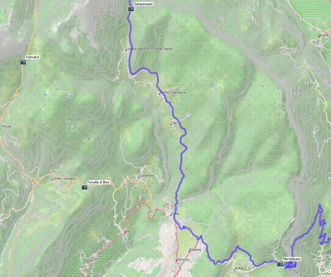 Den eigentlich jetzt üblichen Verdächtigen „Gampen“ lassen wir heute rechts liegen und folgen stattdessen, bei Fondo, unserer Route in Richtung Proveis.