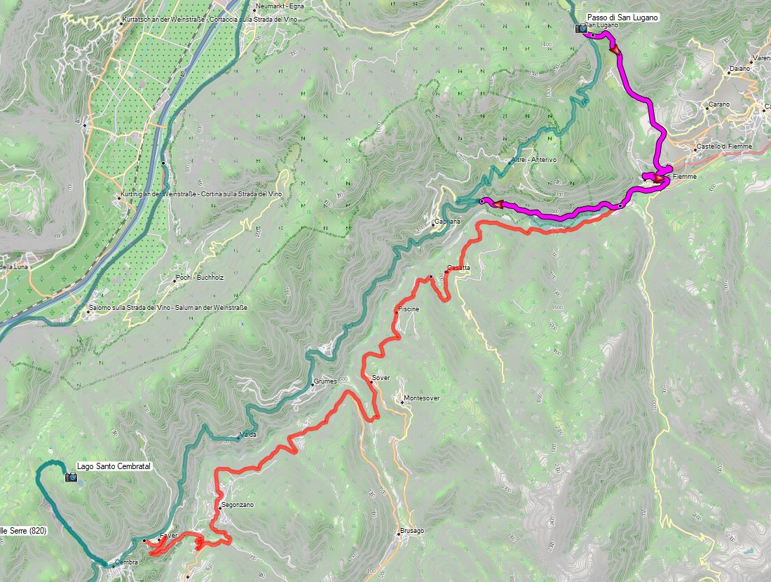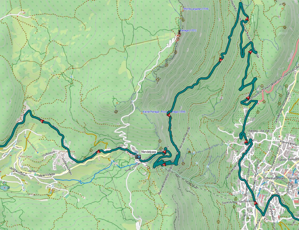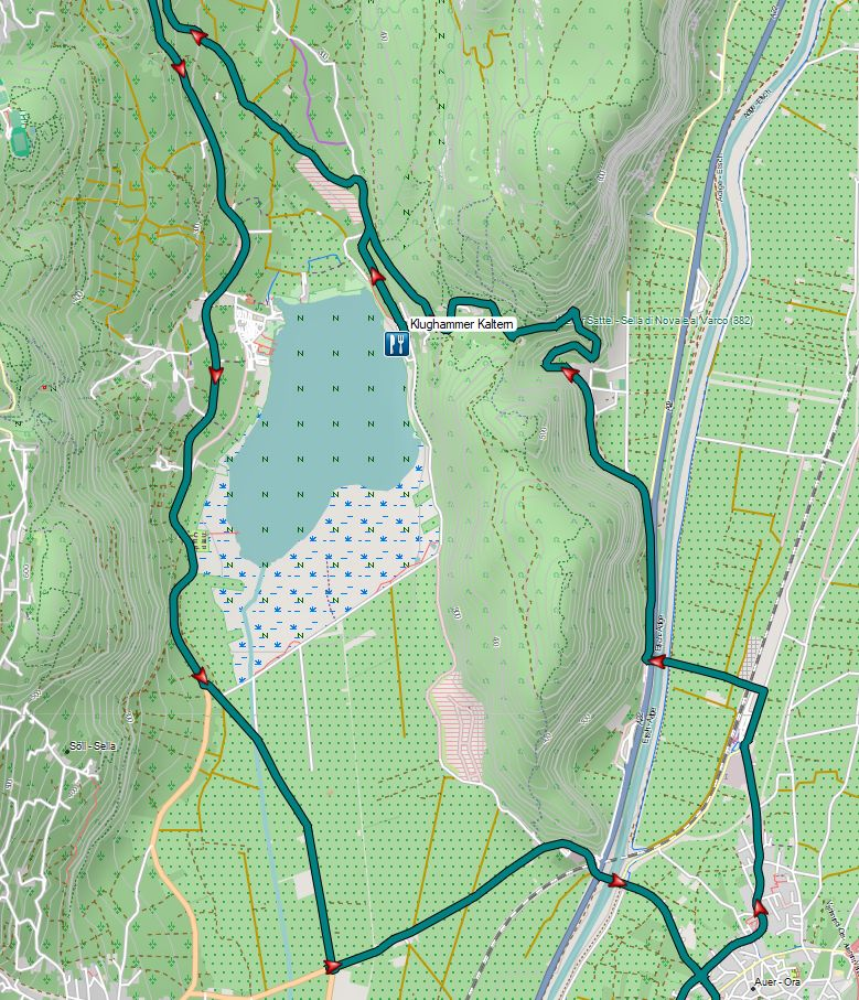 Hinter dem Kalterer See orientieren wir uns in Richtung Neumarkt und Auer und fahren dann bergan hinauf in grobe Richtung Fassatal / Fleimstal.