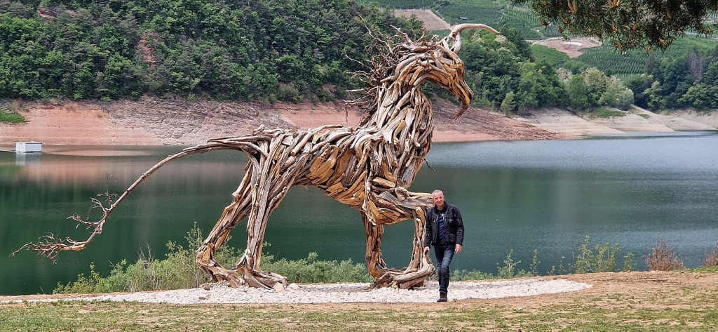 Der Holzbildhauer hat Wurzeln und Holz in Ufernähe gesammelt und daraus dann dieses Werk geschaffen. Einfach wunderbar mit einer Betonung auf „Wunder“. 7 Meter lang und 5 m hoch ist die Skulptur und somit eines Sauriers durchaus würdig.