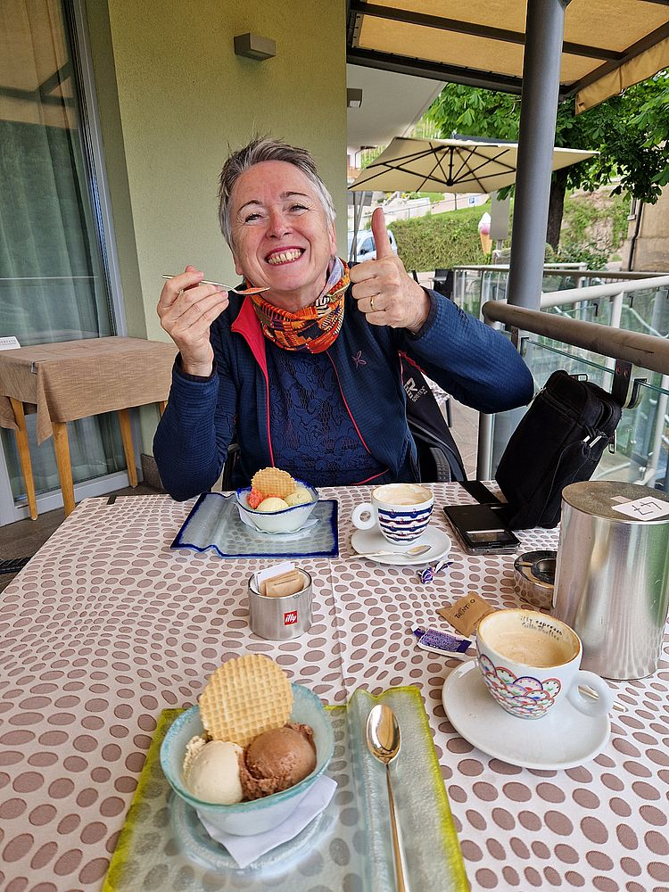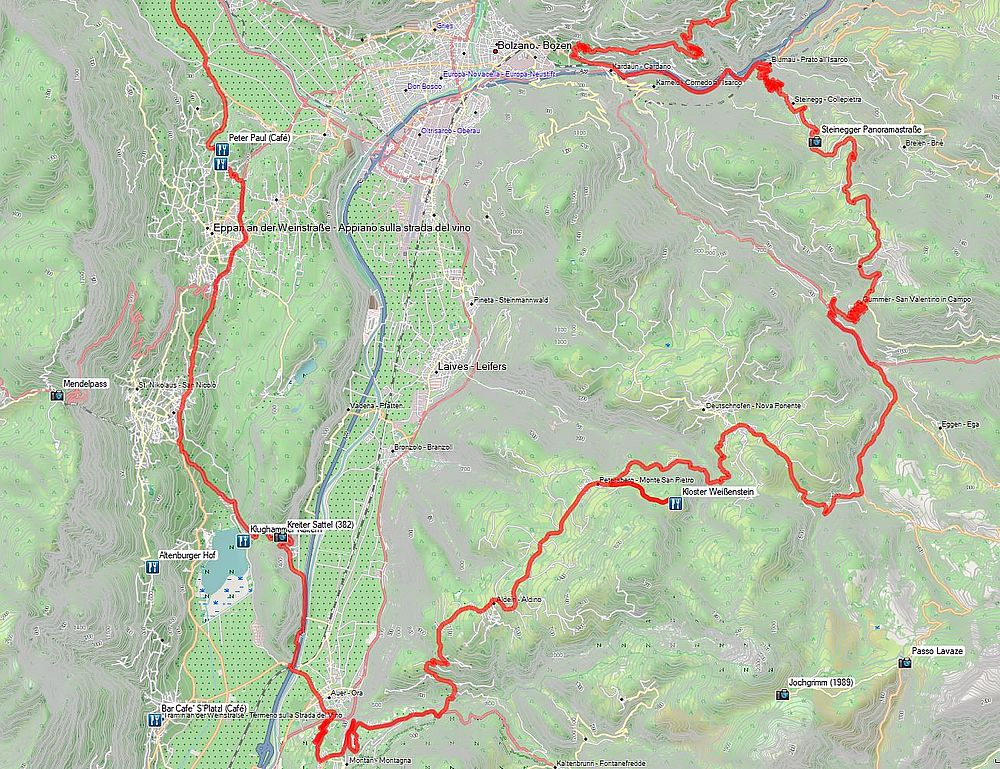 Erfahrene „Eisliebhaber“ wie euer Erzähler riechen jetzt schon den Eisbecher. Terlan ist bereits ausgeschrieben auf den Hinweisschildern und so machen wir unsere heutige Rundtour komplett. Bergab mäandert die Straße nach Terlan und dann zum Cafe Wieterer. Füße unter den Tisch und ein breites Grinsen im Gesicht. Gut haben wir das gemacht. Etwas über 150 km Rundstrecke um Bozen erledigt, obwohl wir Luftlinie nie weiter als 20 km entfernt waren. Eine schöne Runde mit wunderbaren Ausblicken und einer durchaus auch anspruchsvollen Strecke.
