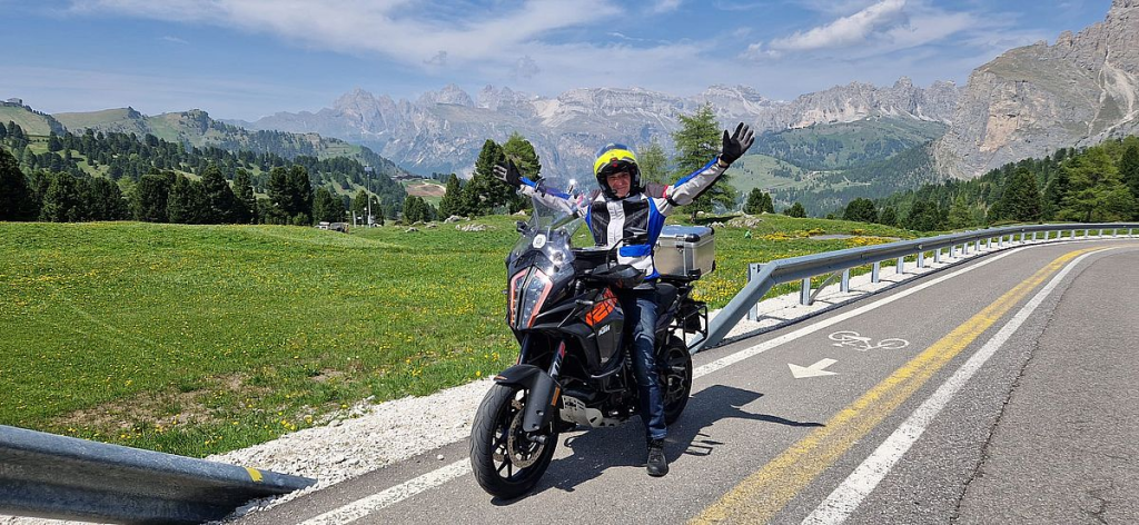Mit dem Fahrrad wäre ich bereits auf halber Strecke ein Fall für Wiederbelebungsmaßnahmen oder ein Sauerstoffzelt. Mit dem Motorrad genieße ich Streckenverlauf und die traumhafte Umgebung. So bekannte Namen wie Langkofel, Sass Pordoi und Piz Boé zeigen ihre majestätischen Gipfel. Wie immer in Südtirol und dem Trentino Ausblicke für die Ewigkeit.