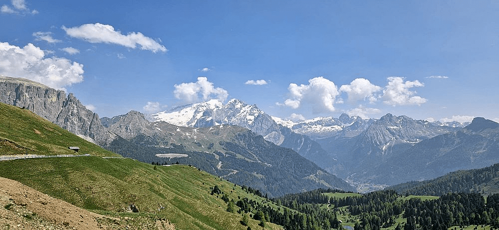 Der Pordoi ist Bestandteil der großen Dolomitenstraße und der Bau wurde bereits 1905 vollendet. Mit seinen 2.239 Metern ist er der höchste asphaltierte Passübergang in den Dolomiten und war schon des Öfteren Zielankunft beim Giro d`Italia. Südlich von uns liegt die Marmolata und der Fedaiapass.