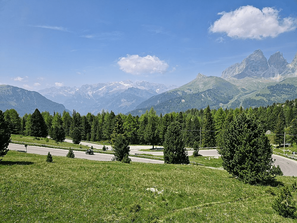 Schön kurvig geht es zunächst durch bewaldetes Gebiet mit einem schönen Blick auf die Bergkette der Croda da Lago. Auch für Wanderer ein schönes Ziel. Auf der Passhöhe ist dann der Ausblick wirklich grandios.