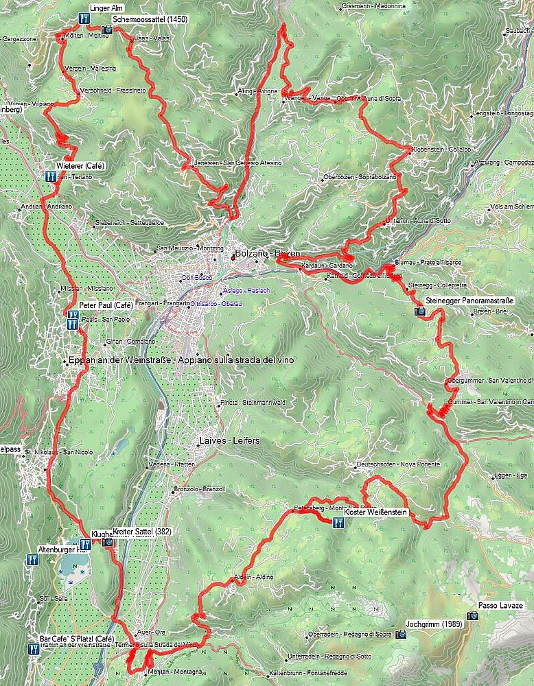 Wir ziehen heute einen wunderbaren Kreis rund um Südtirols Landeshauptstadt Bozen und sind dabei Luftlinie nie mehr als 20 km von der Stadt entfernt. Okay – so ganz rund und geometrisch in Ordnung ist unser Kreis nicht. Archimedes würde sicherlich die Stirn in Falten legen. Aber meines Wissens war Archimedes auch kein Motorradfahrer. Tolerant wie er war könnte er aber heute sicherlich unser Bedürfnis auf den ein oder anderen Schlenker in diesem Kreis nachvollziehen.