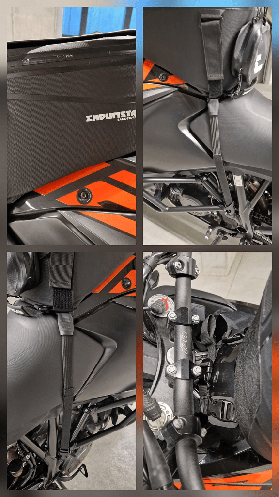Hier merkt man, dass die ursprüngliche Zielgruppe von Enduristan die Endurofahrer waren, welche auch tatsächlich im Gelände unterwegs sind und eine „wackelnde Gepäcklösung“ auf dem Tank de facto nicht gebrauchen können.
